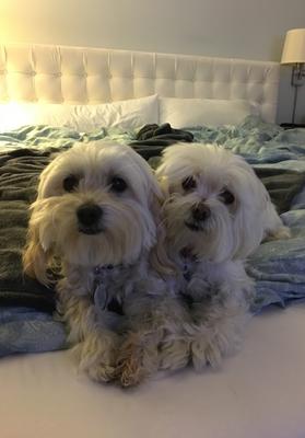I didn’t choose Cali, she chose me. When I spoke she was the only Maltese in her litter to cock her head. It was love at first sight for both of us. Cali enjoyed 6 months as the center of attention until we brought home a sister for her, Lola - a Havanese. Cali followed her around curiously for a couple days until she realized that Lola was here to stay and then decided to adopt Lola as her own.