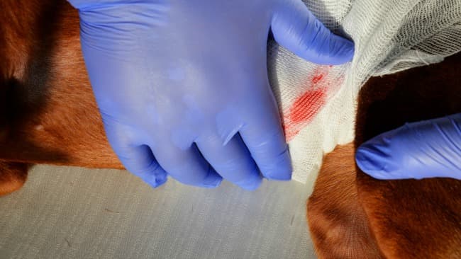 Pressing clean gauze to wound on injured dogIf the wound is spurting bright red blood this could mean that an artery is involved, this is life threatening. Try to elevate the area (easiest if the injured area is an leg